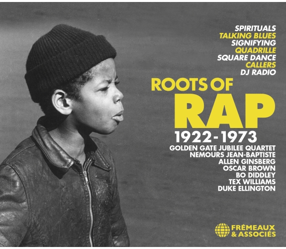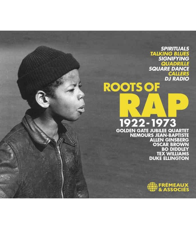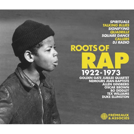 DISC 2 - FORERUNNERS OF RAP : 1. JE NE SUIS PAS BIEN PORTANT – OUVRARD 3’12. RADIO DJ : 2. ROCKET SHIP SHOW - JOCKO HENDERSON 0’34 • 3. THE MOONDOG SHOW - ALAN FREED 0’46. TALKING BLUES : 4. THE AMERICAN WOMAN AND WEST INDIAN MAN PT. 2 - SAM MANNING 2’55 • 5. SPECIAL STREAM LINE - BUKKA WHITE 2’53 • 6. SMOKE! SMOKE! SMOKE! THAT CIGARETTE - TEX WILLIAMS 2’54 • 7. SUSPICION - TEX WILLIAMS 2’55 • 8. KILLER DILLER - GENE COY 2’50 • 9. HOT ROD RACE - RAMBLIN’ JIMMY DOLAN 2’32 • 10. MARIE LAVEAU - PAPA CÉLESTIN 6’36 • 11. COPS AND ROBBERS - BOOGALOO 3’00 • 12. CLOTHES LINE - BOOGALOO 2’24 • 13. STRANDED IN THE JUNGLE - THE JAYHAWKS 2’50 • 14. JOHN L’S HOUSE RENT BOOGIE - JOHN LEE HOOKER 4’23 • 15. SIGNIFYING BLUES - BO DIDDLEY 4’28. JAZZ : 16. ZAJJ’S DREAM - DUKE ELLINGTON 3’03 • 17. READINGS FROM “ON THE ROAD” AND “VISIONS OF CODY” - JACK KEROUAC 3’30 • 18. MANHATTAN - GEORGE RUSSELL W/JON HENDRICKS 10’33 • 19. DRIVA’ MAN - MAX ROACH 5’15 • 20. BID ‘EM IN - OSCAR BROWN 1’31 • 21. JE SUIS UN SAUVAGE - ALFRED SANVI PANOU ET L’ART ENSEMBLE OF CHICAGO (SOUS LICENCE SARAVAH) 4’12• 22. C’EST NORMAL - BRIGITTE FONTAINE ET ARESKI (SOUS LICENCE SARAVAH) 4’23.